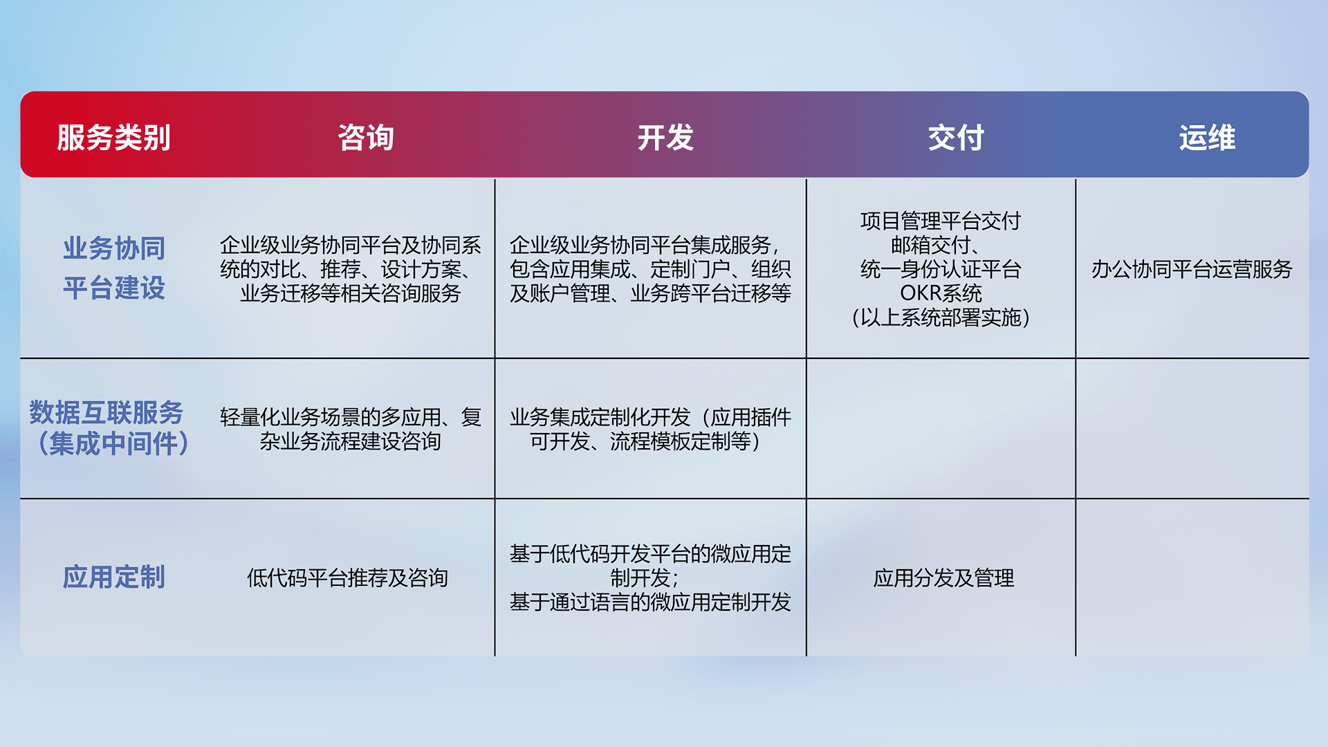 针对钉钉、、、企微、、、IDaas等平台级产品提供产品的规划、、、、方案、、、、交付、、定制化开发等服务,,,实现如统一协同办公、、、智能客户服务、、、混合会议管理、、智能数据查询、、、、等业务场景,,实现数字化转型。。
